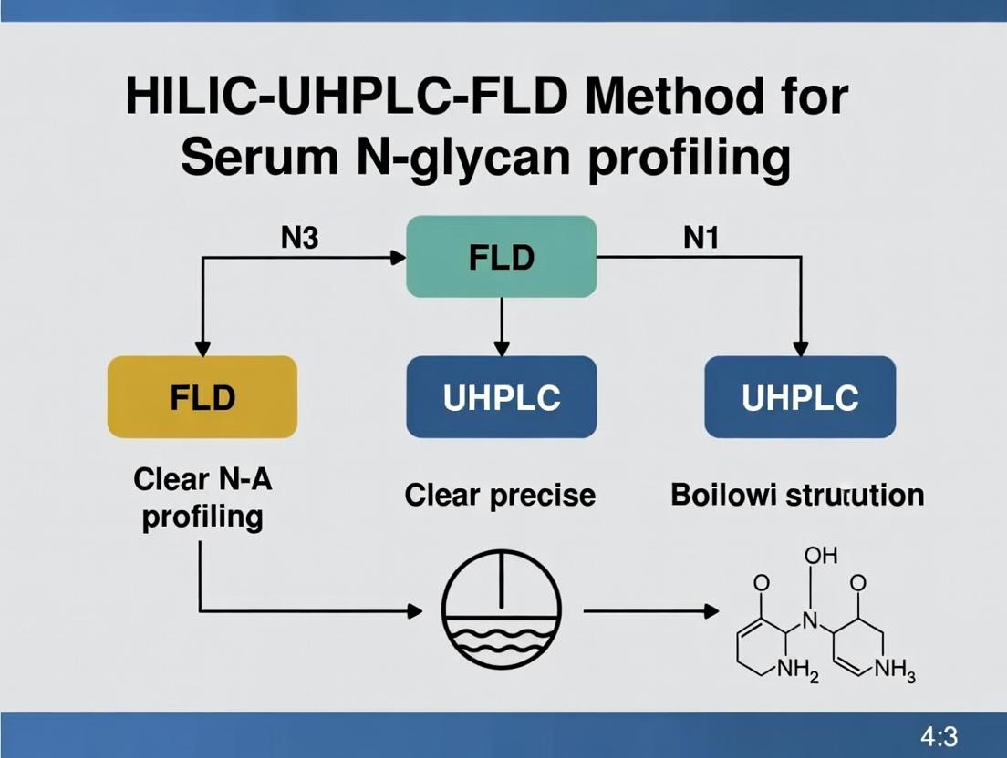 This article provides a detailed and current overview of Hydrophilic Interaction Liquid Chromatography coupled with Ultra-High Performance Liquid Chromatography and Fluorescence Detection (HILIC-UHPLC-FLD) for serum N-glycan analysis. Targeting researchers and drug development professionals, we explore the foundational principles of N-glycosylation as a critical post-translational modification linked to disease. The guide details a step-by-step methodological workflow from sample preparation to data analysis, addresses common troubleshooting and optimization challenges, and critically evaluates the method's validation parameters and performance against alternative techniques like MS and CE. This resource aims to empower scientists to implement robust, high-throughput glycan profiling for biomarker discovery and biotherapeutic development.